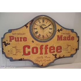 Brand New in Box Unique Coffee Clock With An Aged Appearance Great for the kitchen! ~ Great for a restaurant! You'll love the look of this clock! Made of wood with metal around the face of the clock. The quartz clock movement operates on one "AA" battery (not included). Features two slots for secure hanging. The clock measures 12"H x 18"L